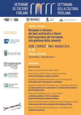 Il recupero e la salvaguardia del patrimonio custodito nei nostri archivi e nelle nostre biblioteche dipende molto dalla selezione e dall'applicazione di buone pratiche, dalla ricerca e dalla conseguente valorizzazione delle migliori competenze maturate in contesti operativi anche diversi. Il convegno intende soffermarsi su quanto è stato fatto in Friuli a partire dall’esperienza del terremoto e sui sistemi di prevenzione dei rischi che minacciano il patrimonio culturale archivistico e librario.